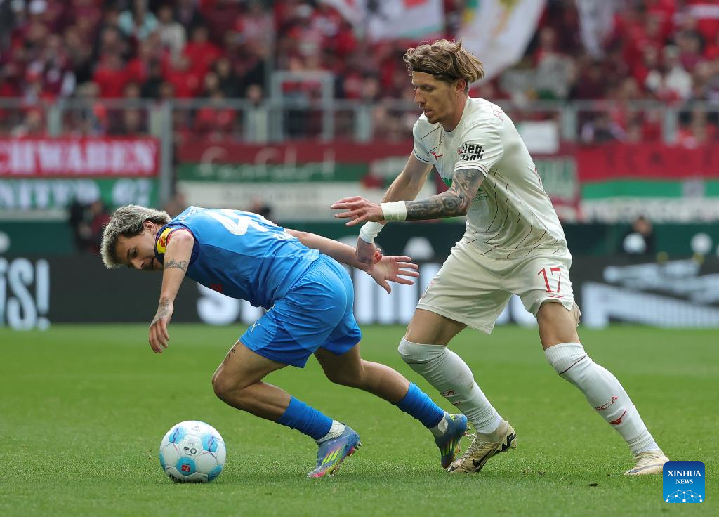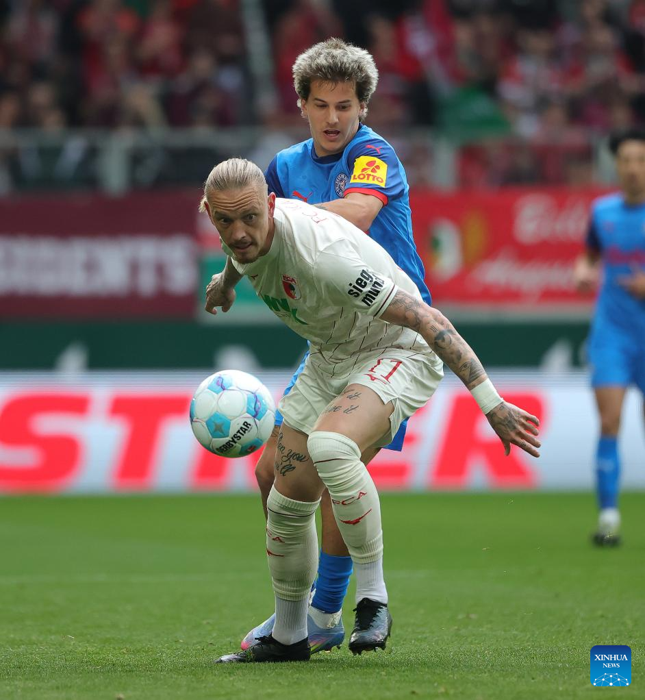 Kristijan Jakic (R) of FC Augsburg vies with John Tolkin of Holstein Kiel during the German first division Bundesliga football match between FC Augsburg and Holstein Kiel in Augsburg, Germany, May 4, 2025. (Photo by Philippe Ruiz/Xinhua)