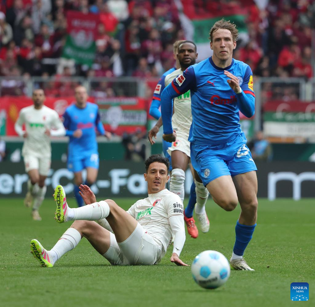 Lasse Rosenboom (front) of Holstein Kiel breaks through during the German first division Bundesliga football match between FC Augsburg and Holstein Kiel in Augsburg, Germany, May 4, 2025. (Photo by Philippe Ruiz/Xinhua)