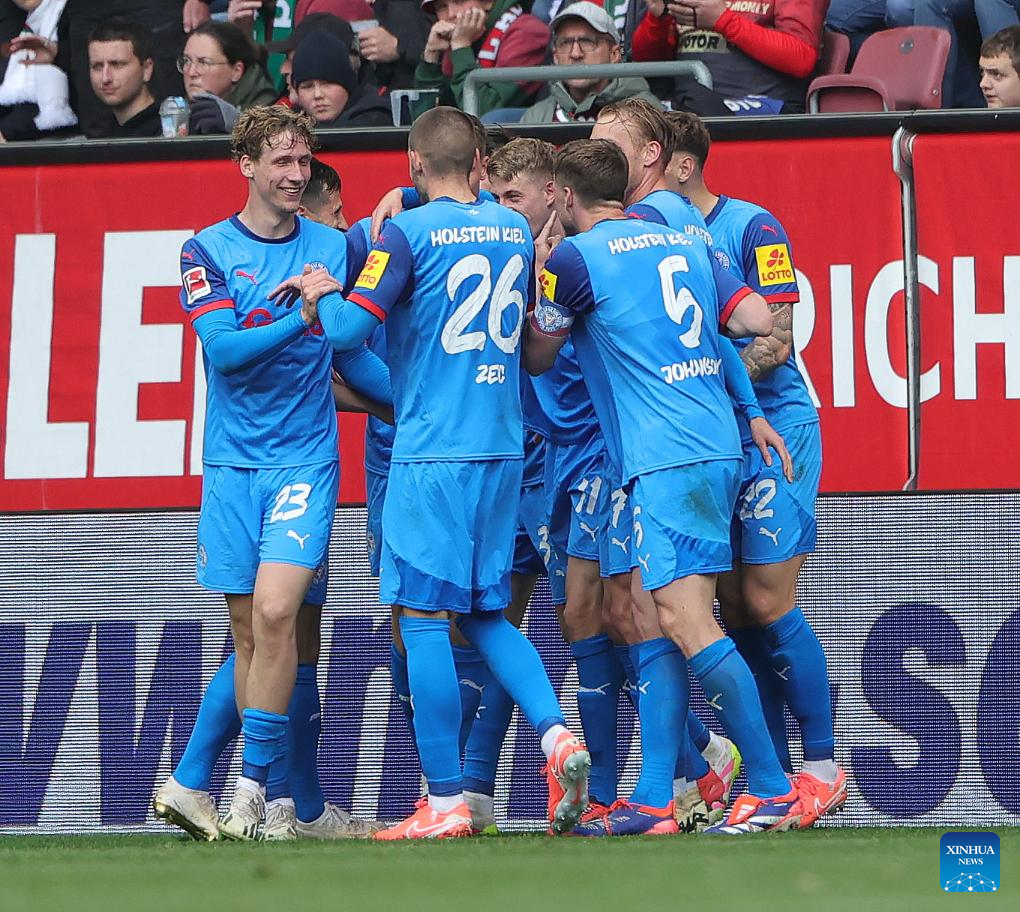 Players of Holstein Kiel celebrate the second goal during the German first division Bundesliga football match between FC Augsburg and Holstein Kiel in Augsburg, Germany, May 4, 2025. (Photo by Philippe Ruiz/Xinhua)
