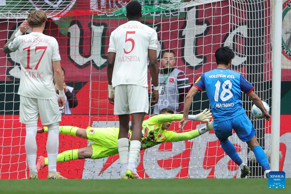 Shuto Machino (1st R) of Holstein Kiel shoots a penalty to score during the German first division Bundesliga football match between FC Augsburg and Holstein Kiel in Augsburg, Germany, May 4, 2025. (Photo by Philippe Ruiz/Xinhua)