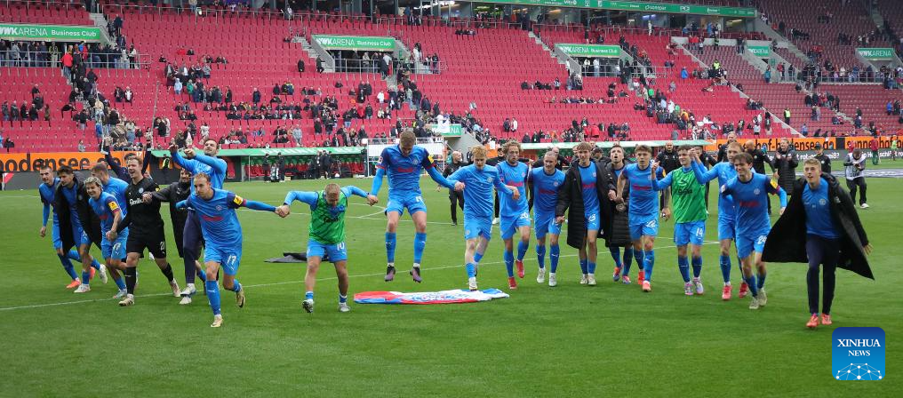 Players of Holstein Kiel celebrate the victory after the German first division Bundesliga football match between FC Augsburg and Holstein Kiel in Augsburg, Germany, May 4, 2025. (Photo by Philippe Ruiz/Xinhua)