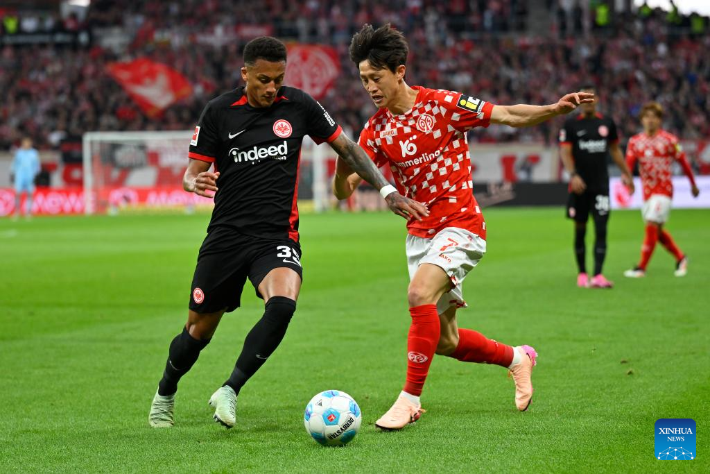 Lee Jae-Sung (R) of FSV Mainz 05 vies with Tuta of Eintracht Frankfurt during the German first division Bundesliga football match in Mainz, Germany, May 4, 2025. (Photo by Ulrich Hufnagel/Xinhua)