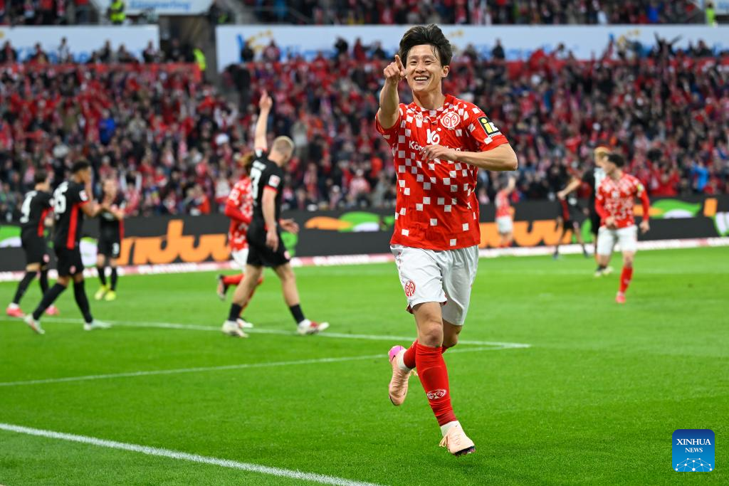 Lee Jae-Sung of FSV Mainz 05 celebrates after the offside goal during the German first division Bundesliga football match between FSV Mainz 05 and Eintracht Frankfurt in Mainz, Germany, May 4, 2025. (Photo by Ulrich Hufnagel/Xinhua)
