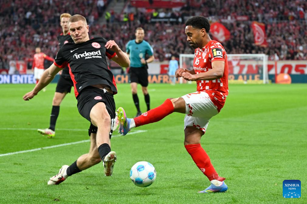 Philipp Mwene (R) of FSV Mainz 05 vies with Rasmus Christensen of Eintracht Frankfurt during the German first division Bundesliga football match in Mainz, Germany, May 4, 2025. (Photo by Ulrich Hufnagel/Xinhua)