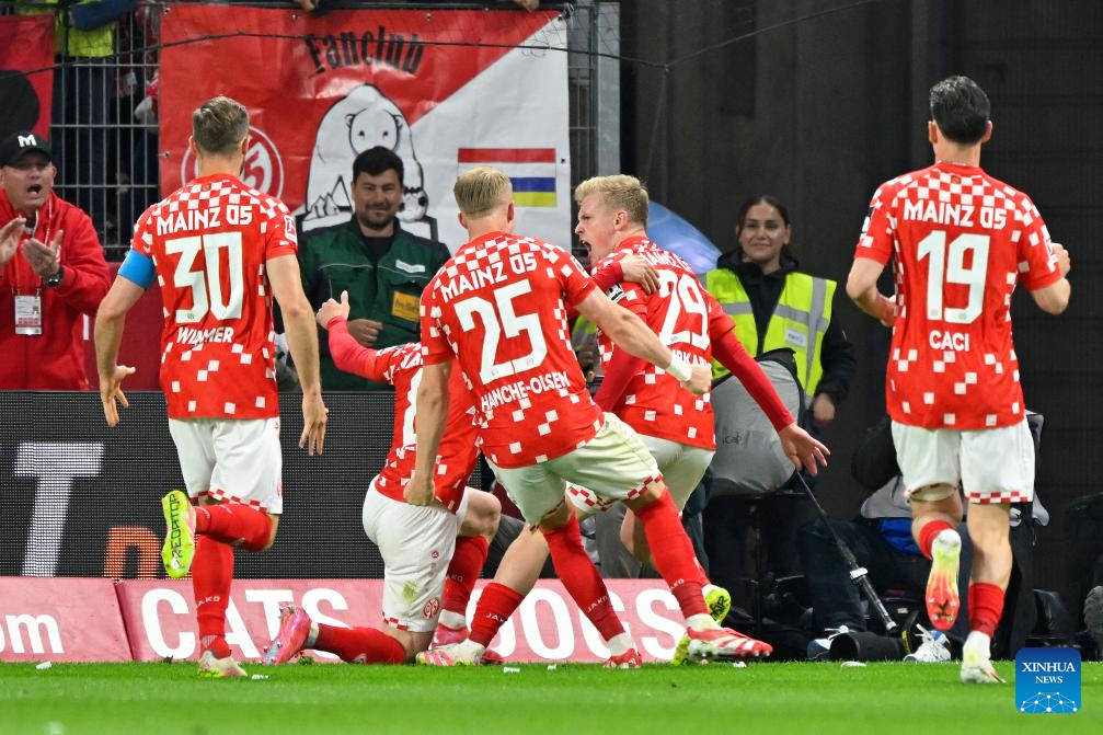 Jonathan Burkardt (2nd R) of FSV Mainz 05 celebrates scoring with teammates during the German first division Bundesliga football match between FSV Mainz 05 and Eintracht Frankfurt in Mainz, Germany, May 4, 2025. (Photo by Ulrich Hufnagel/Xinhua)