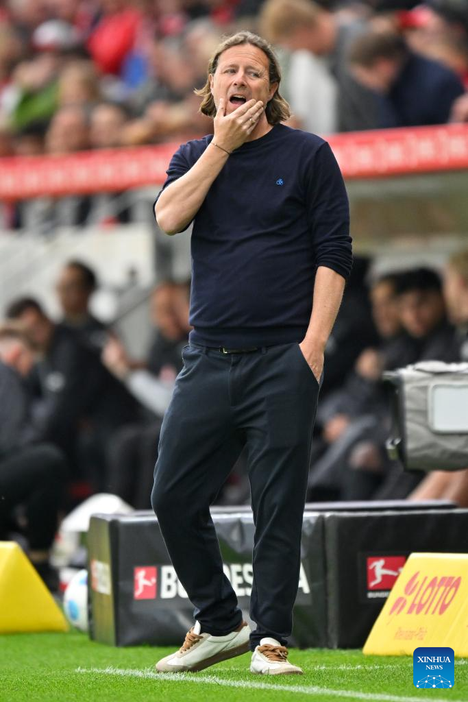 Bo Henriksen, head coach of FSV Mainz 05, reacts during the German first division Bundesliga football match between FSV Mainz 05 and Eintracht Frankfurt in Mainz, Germany, May 4, 2025. (Photo by Ulrich Hufnagel/Xinhua)