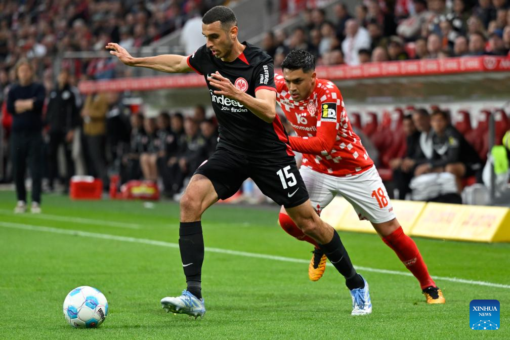 Nadiem Amiri (R) of FSV Mainz 05 vies with Ellyes Skhiri of Eintracht Frankfurt during the German first division Bundesliga football match in Mainz, Germany, May 4, 2025. (Photo by Ulrich Hufnagel/Xinhua)