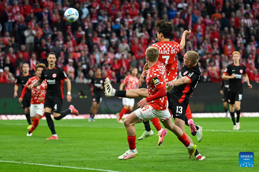 Lee Jae-Sung (top) of FSV Mainz 05 competes during the German first division Bundesliga football match between FSV Mainz 05 and Eintracht Frankfurt in Mainz, Germany, May 4, 2025. (Photo by Ulrich Hufnagel/Xinhua)