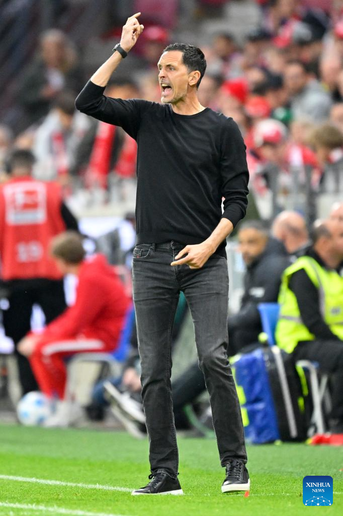 Dino Toppmoeller, head coach of Eintracht Frankfurt, instructs during the German first division Bundesliga football match between FSV Mainz 05 and Eintracht Frankfurt in Mainz, Germany, May 4, 2025. (Photo by Ulrich Hufnagel/Xinhua)
