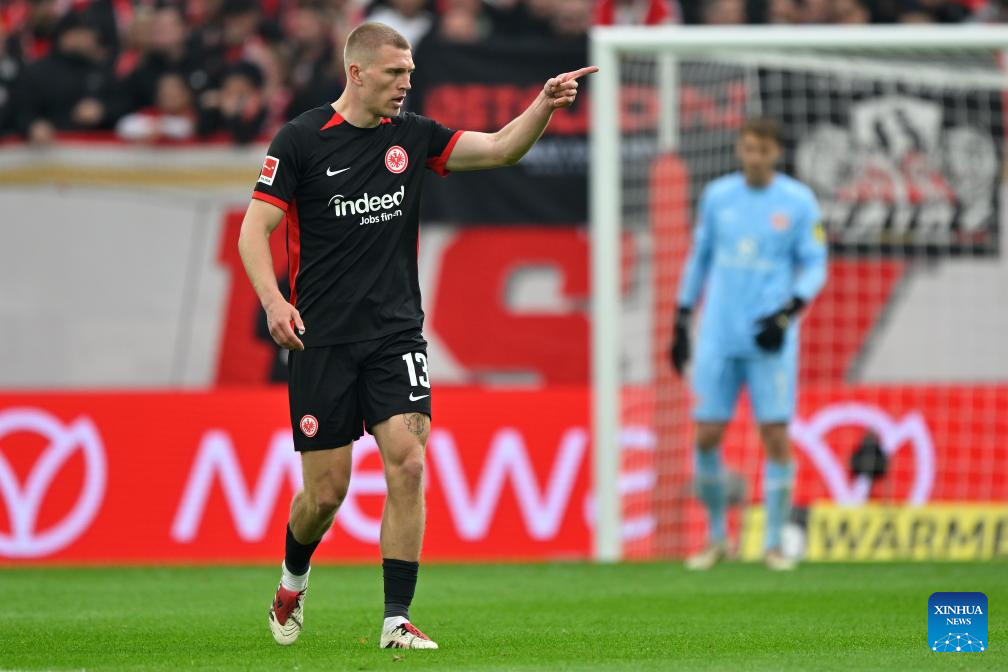Rasmus Christensen of Eintracht Frankfurt celebrates scoring during the German first division Bundesliga football match between FSV Mainz 05 and Eintracht Frankfurt in Mainz, Germany, May 4, 2025. (Photo by Ulrich Hufnagel/Xinhua)