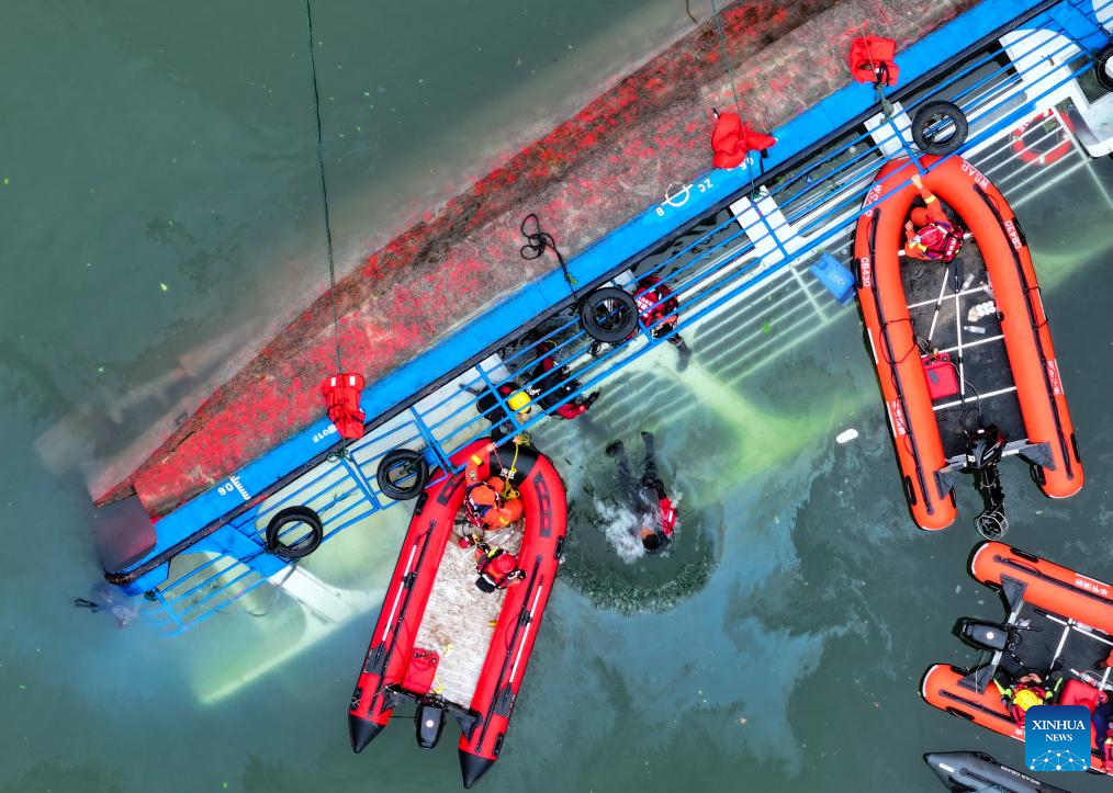 Rescuers carry out search and rescue operations after the boat capsize accident took place in Qianxi City, southwest China's Guizhou Province, May 5, 2025. Nine people died and one is missing in boat capsize accident in a river of Qianxi City, southwest China's Guizhou Province, on Sunday afternoon, according to local authorities.