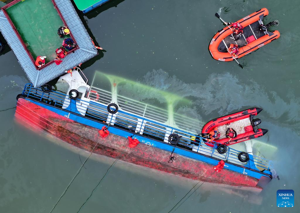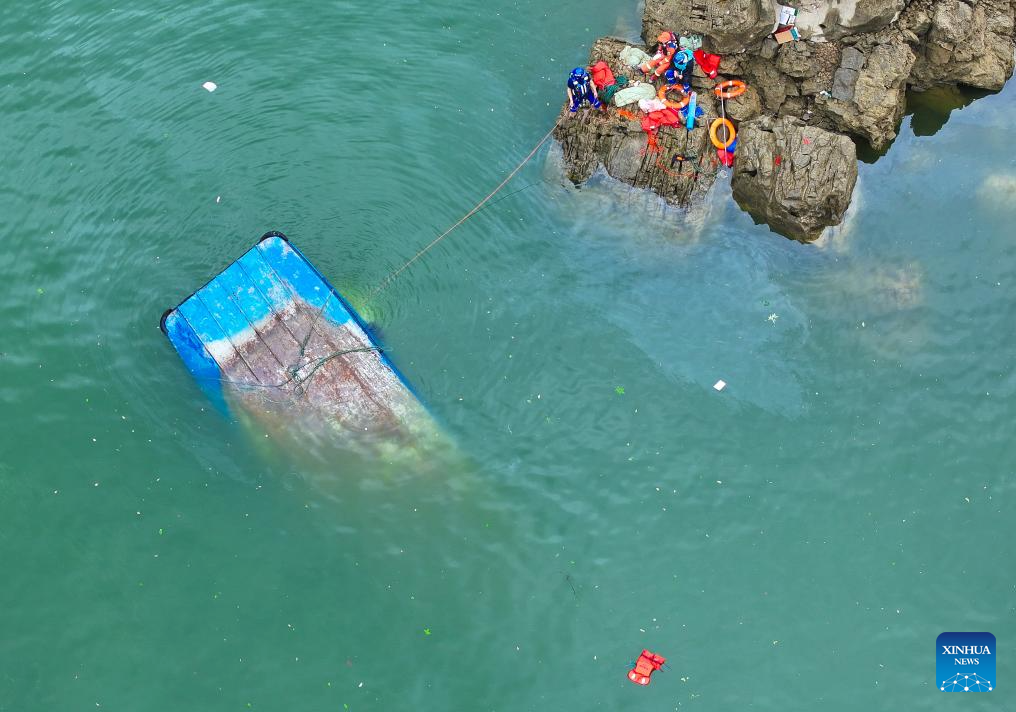 An aerial drone photo taken on May 5, 2025 shows rescuers carrying out search and rescue operations after the boat capsize accident took place in Qianxi City, southwest China's Guizhou Province. Nine people died and one is missing in boat capsize accident in a river of Qianxi City, southwest China's Guizhou Province, on Sunday afternoon, according to local authorities. (Xinhua/Liu Xu)