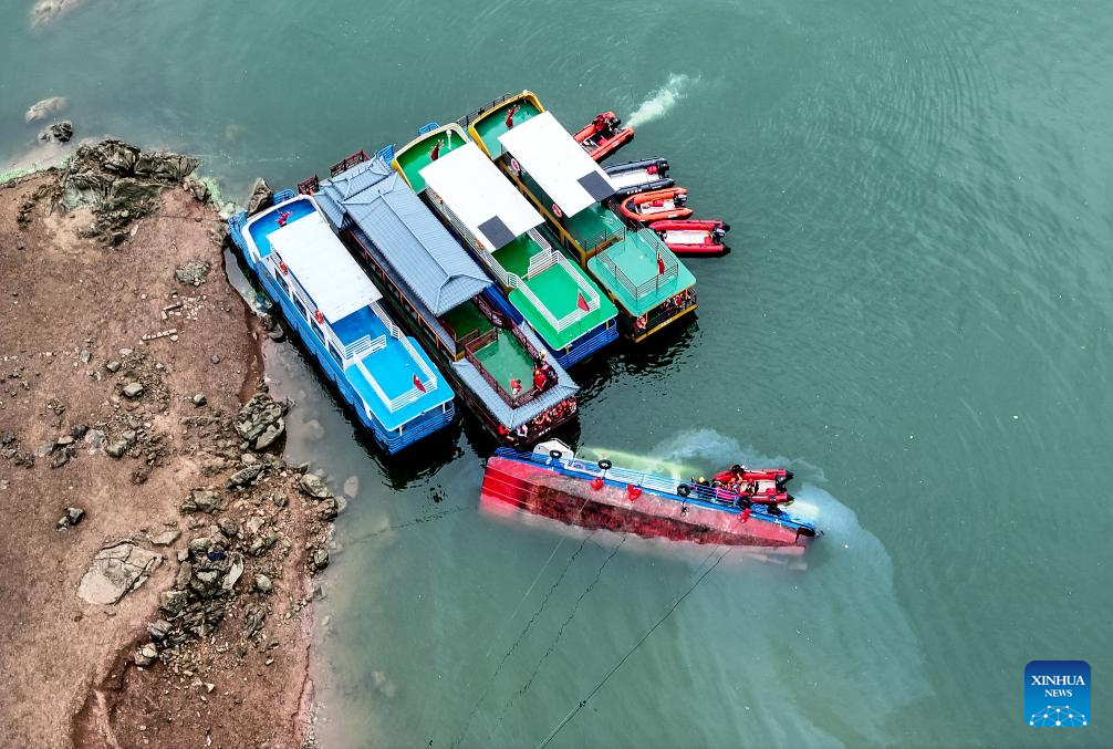 Four boats capsized in sudden strong winds in a river of Qianxi City, southwest China's Guizhou Province on Sunday afternoon, plunging 84 individuals into the water. Provincial authorities have deployed nearly 500 emergency responders to coordinate rescue efforts. The aftermath handling of the accident is still proceeding. (Xinhua/Liu Xu)