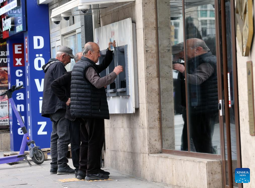 People withdraw money from ATMs in Ankara, Türkiye, on May 5, 2025. Türkiye's annual inflation rate dipped slightly in April to 37.86 percent, down from 38.1 percent in March, according to the latest data released by the Turkish Statistical Institute on Monday. (Mustafa Kaya/Handout via Xinhua)