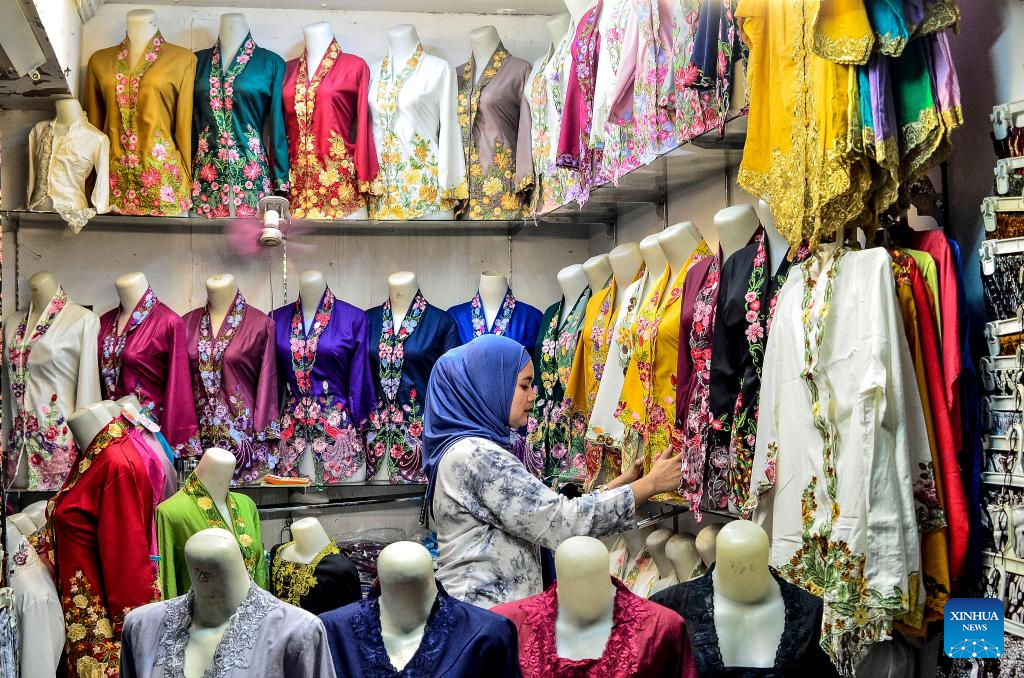 A merchant checks traditional clothes displayed at her stall at Beringharjo traditional market in Yogyakarta, Indonesia, May 5, 2025. Indonesia posted an economic growth rate of 4.87 percent year-on-year in the first quarter of 2025, according to data released by the Central Statistics Agency (BPS) on Monday. (Photo by Agung Supriyanto/Xinhua)