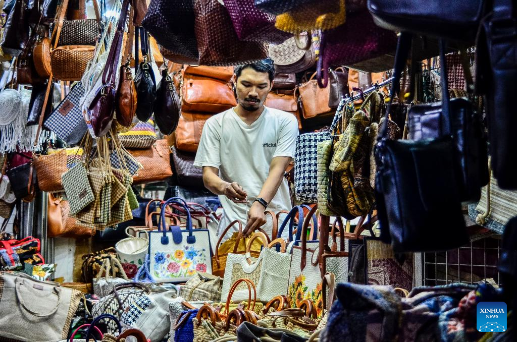 A merchant checks bags displayed at his stall at Beringharjo traditional market in Yogyakarta, Indonesia, May 5, 2025. Indonesia posted an economic growth rate of 4.87 percent year-on-year in the first quarter of 2025, according to data released by the Central Statistics Agency (BPS) on Monday. (Photo by Agung Supriyanto/Xinhua)
