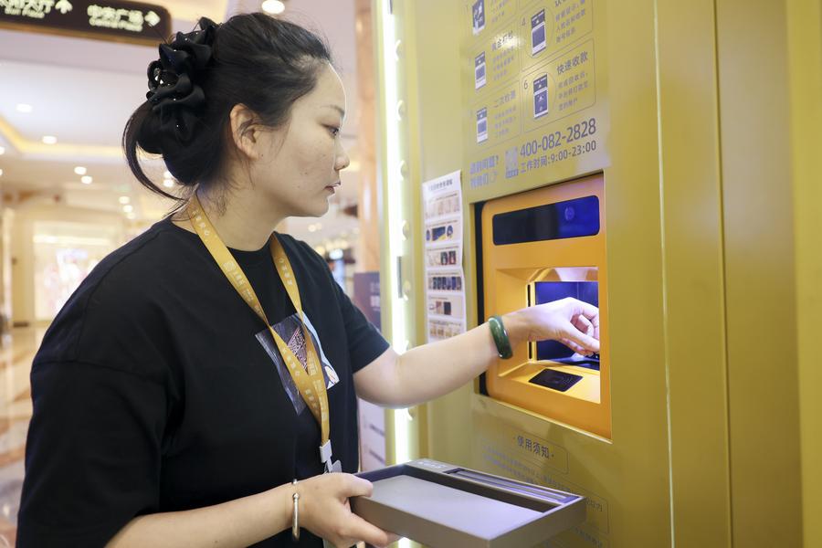 A staff member places gold jewelry into the gold recycling device of a "smart gold store" at a shopping mall in Shanghai, east China, May 5, 2025. (Xinhua/Wang Xiang)A staff member places gold jewelry into the gold recycling device of a "smart gold store" at a shopping mall in Shanghai, east China, May 5, 2025. (Xinhua/Wang Xiang)A staff member introduces a "smart gold store" at a shopping mall in Shanghai, east China, May 5, 2025. (Xinhua/Wang Xiang)People watch the operation of a "smart gold store" at a shopping mall in Shanghai, east China, May 5, 2025. (Xinhua/Wang Xiang)A staff member introduces the gold purchasing device of a "smart gold store" to a man at a shopping mall in Shanghai, east China, May 5, 2025. (Xinhua/Wang Xiang)■