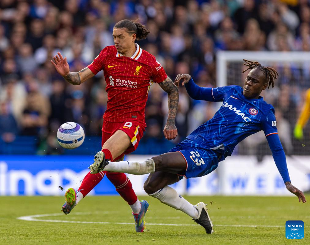 Liverpool's Darwin Nunez (L) is challenged by Chelsea's Trevoh Chalobah during the English Premier League match between Chelsea FC and Liverpool FC in London, Britain, May 4, 2025. (Xinhua)