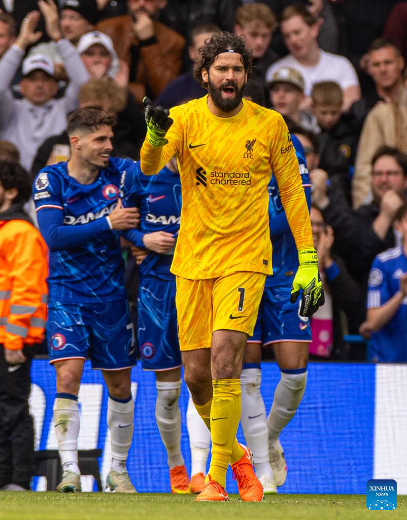 Liverpool's goalkeeper Alisson Becker reacts as Chelsea scores the second goal during the English Premier League match between Chelsea FC and Liverpool FC in London, Britain, May 4, 2025. (Xinhua)