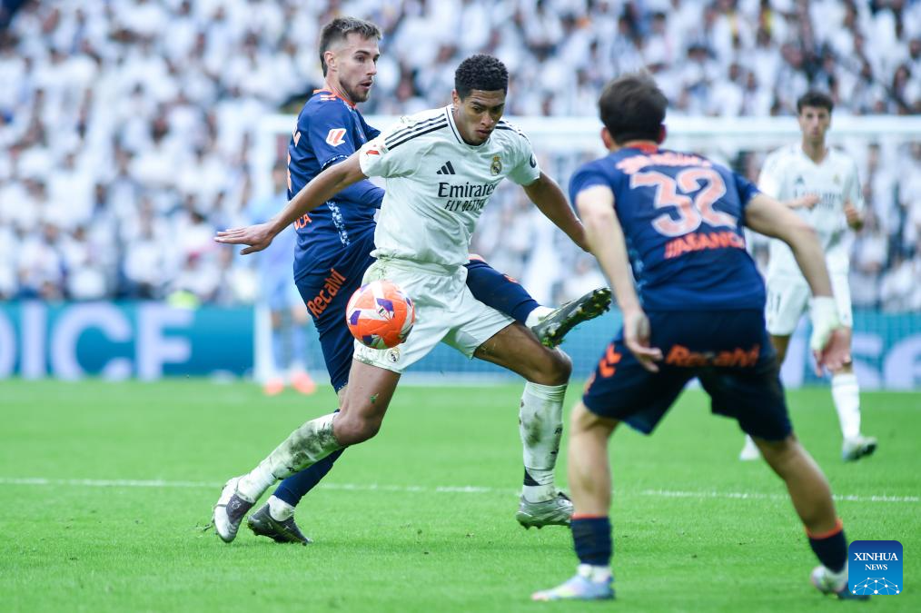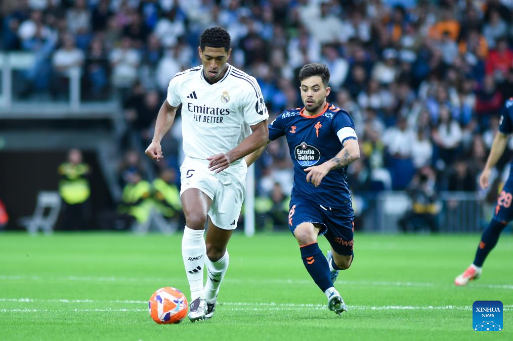 Real Madrid's Jude Bellingham (C) vies with Oscar Mingueza (L) of RC Celta during the Laliga football match between Real Madrid and RC Celta in Santiago Bernabeu Stadium, Madrid, Spain, on May 4, 2025. (Photo by Gustavo Valiente/Xinhua)