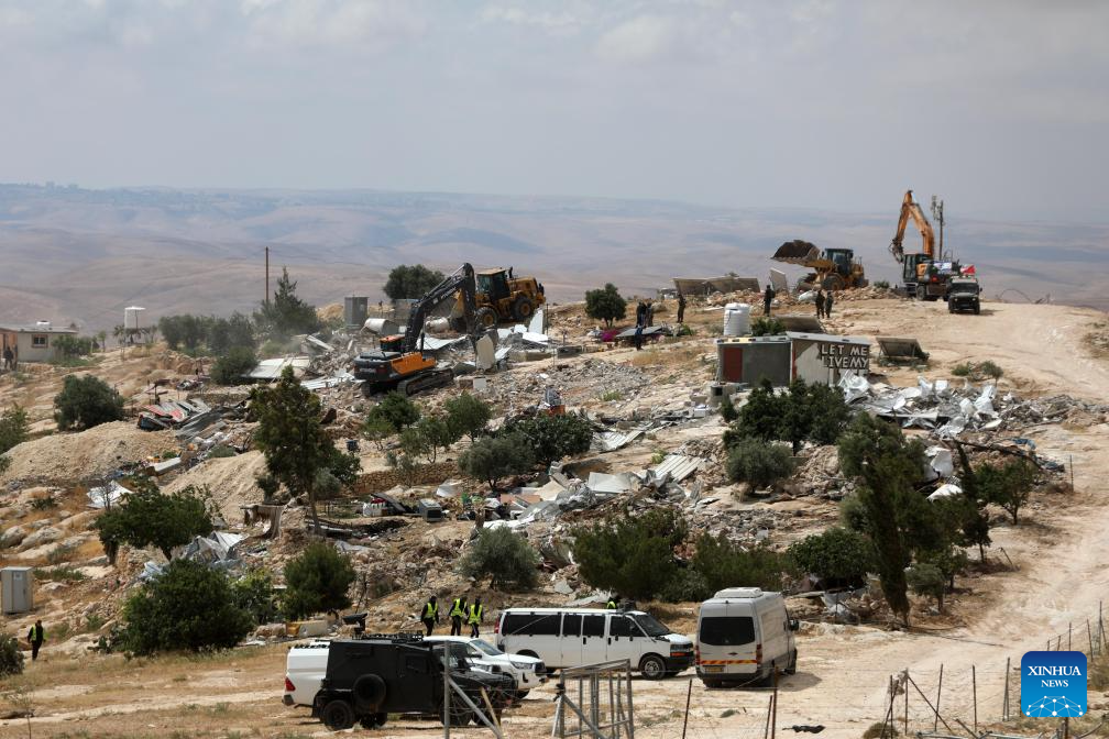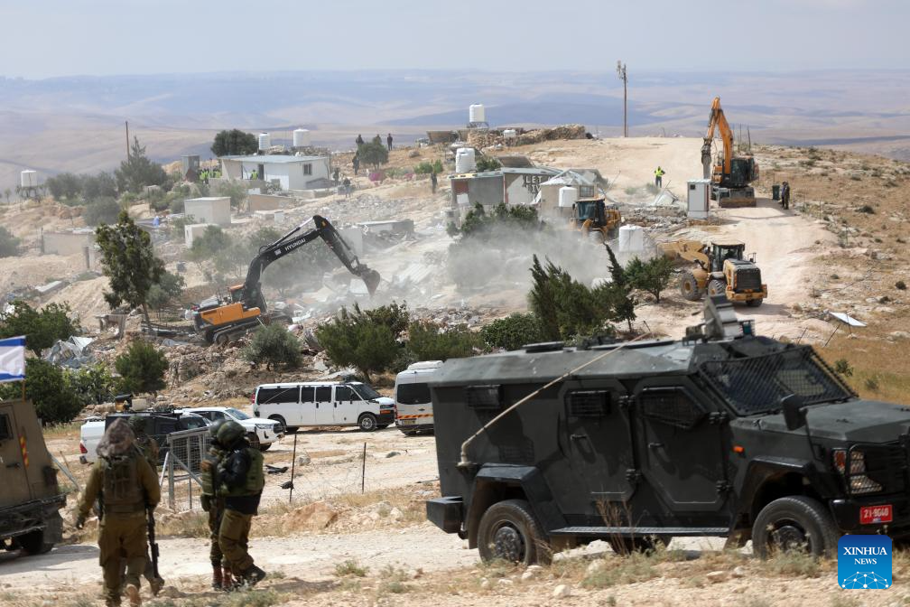 Israeli excavators demolish Palestinians' structures in the village of Khallet al-Dabaa in Masafer Yatta, southern West Bank city of Hebron, on May 5, 2025. (Photo by Mamoun Wazwaz/Xinhua)
