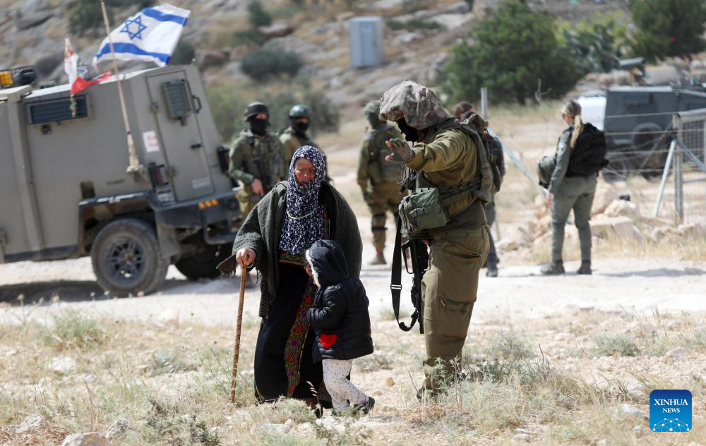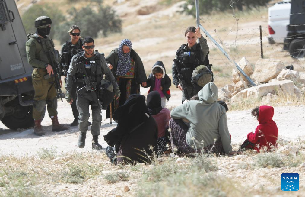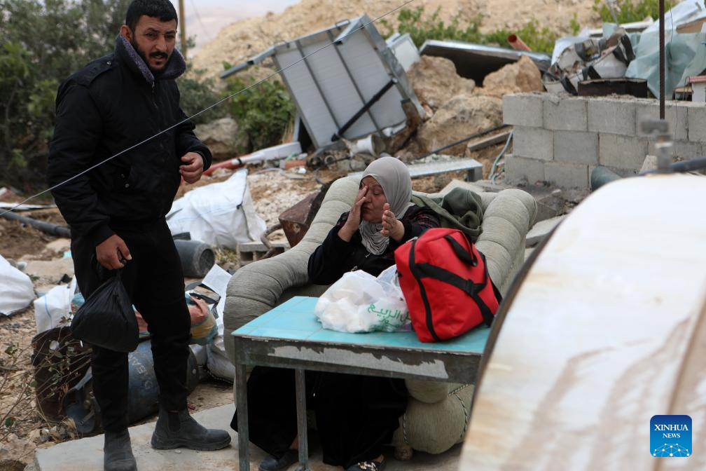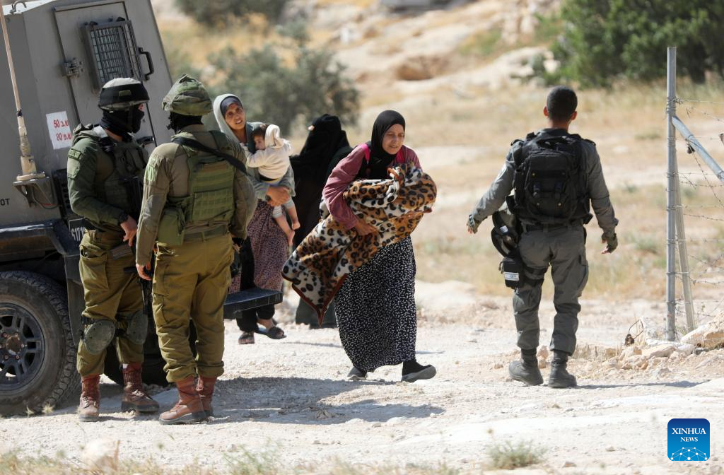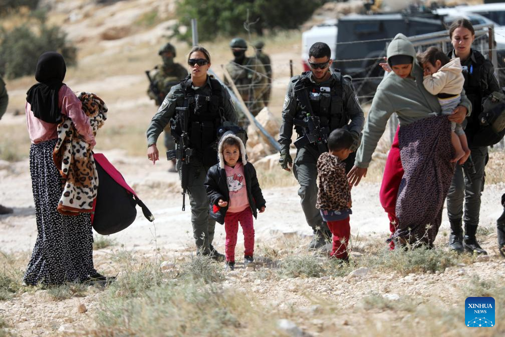 Palestinians are forced to leave their structures by Israeli forces in the village of Khallet al-Dabaa in Masafer Yatta, southern West Bank city of Hebron, on May 5, 2025. (Photo by Mamoun Wazwaz/Xinhua)