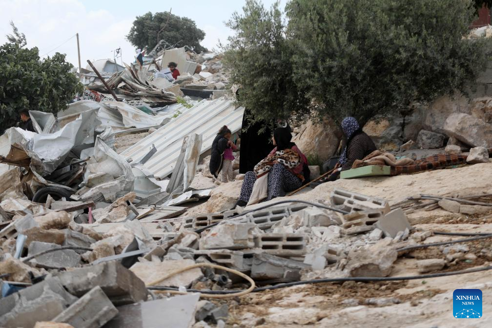 Palestinians are seen after Israeli excavators demolished structures in the village of Khallet al-Dabaa in Masafer Yatta, southern West Bank city of Hebron, on May 5, 2025. (Photo by Mamoun Wazwaz/Xinhua)