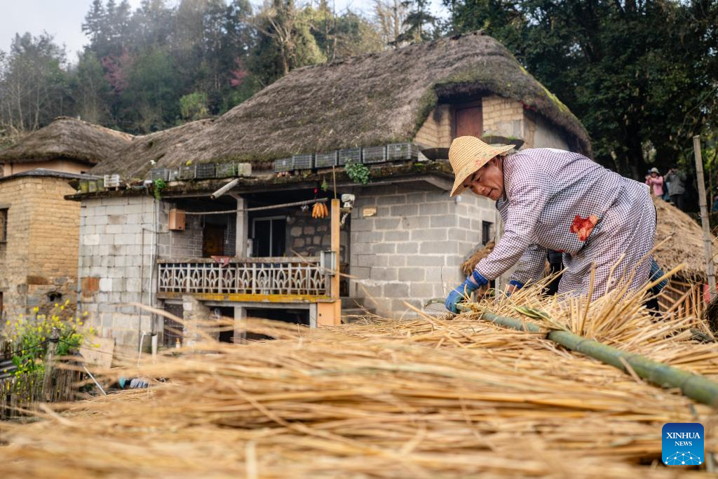 A villager maintains the thatched roof of traditional Hani houses, known locally as "mushroom houses," in Azheke Village of Yuanyang County of Honghe Hani and Yi Autonomous Prefecture, southwest China's Yunnan Province, Feb. 26, 2025. (Xinhua/Hu Chao)