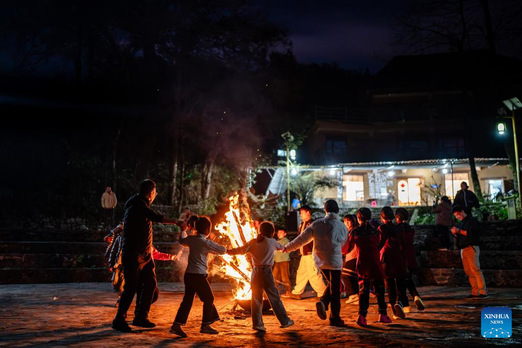 Tourists and local villagers dance around a bonfire in Duoyishu Village of Yuanyang County of Honghe Hani and Yi Autonomous Prefecture, southwest China's Yunnan Province, Feb. 26, 2025. (Xinhua/Hu Chao)