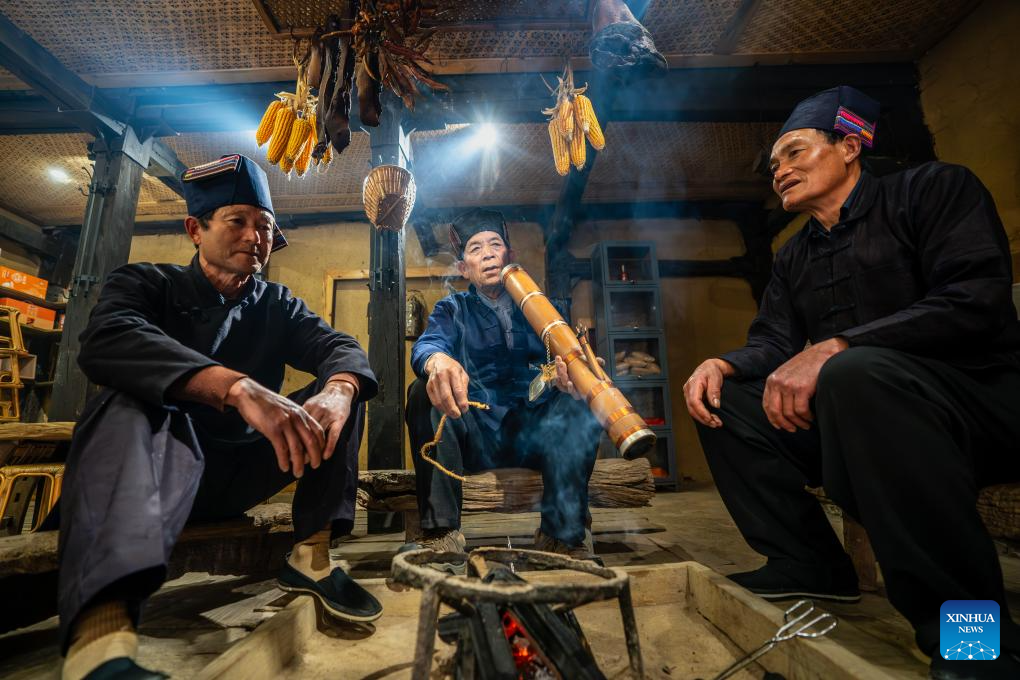 Intangible cultural heritage inheritor Ma Jianchang (C) and his apprentices practice "The Antique Melodies of Hani," a musical drama based on state-level intangible cultural heritage of the Hani ethnic group, in Azheke Village of Yuanyang County of Honghe Hani and Yi Autonomous Prefecture, southwest China's Yunnan Province, Feb. 26, 2025. (Xinhua/Hu Chao)