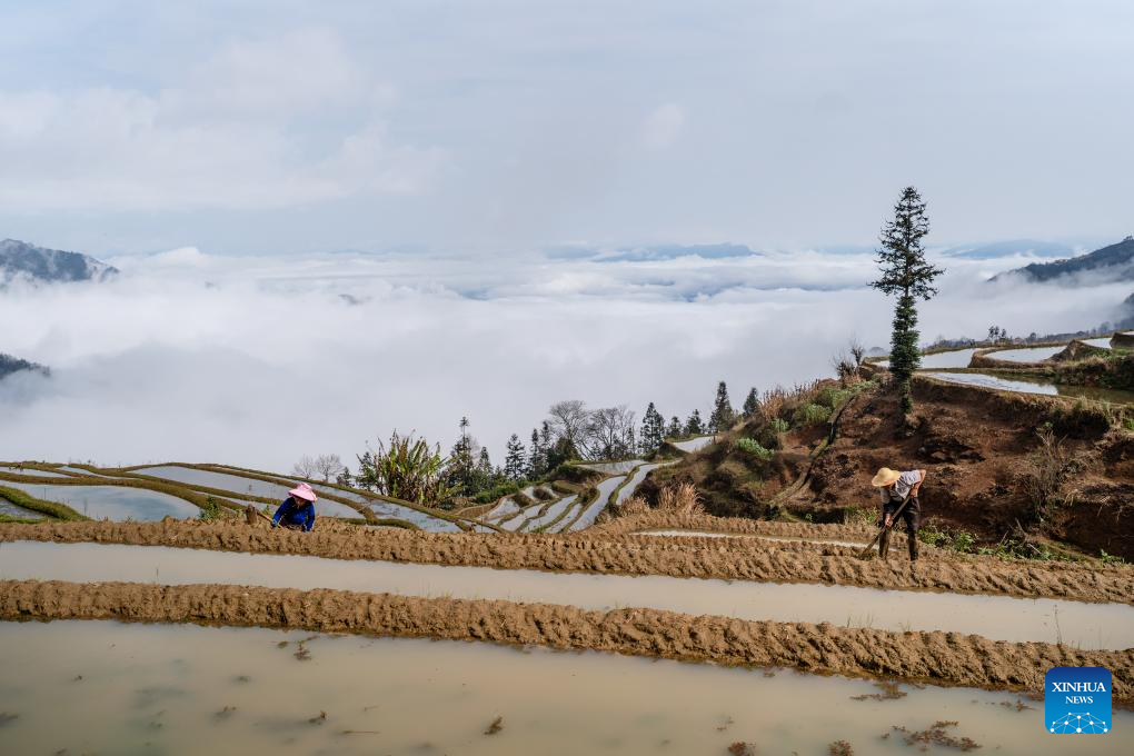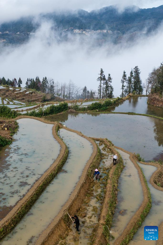 Villagers maintain the ridges of terraced fields in Azheke Village of Yuanyang County of Honghe Hani and Yi Autonomous Prefecture, southwest China's Yunnan Province, Feb. 26, 2025. (Xinhua/Wang Anhaowei)