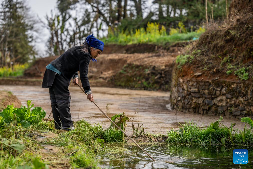 A villager clears the terraced fields in Azheke Village of Yuanyang County of Honghe Hani and Yi Autonomous Prefecture, southwest China's Yunnan Province, Feb. 26, 2025. (Xinhua/Wang Anhaowei)
