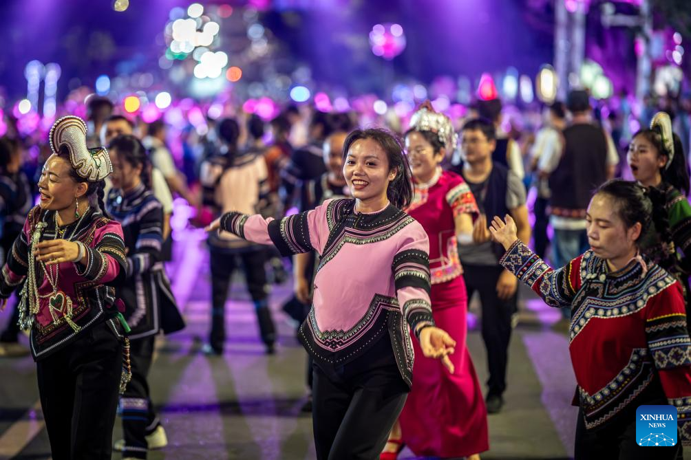 Tourists and local villagers dance during a massive dance party in Honghe County of Honghe Hani and Yi Autonomous Prefecture, southwest China's Yunnan Province, May 1, 2025. (Xinhua/Hu Chao)