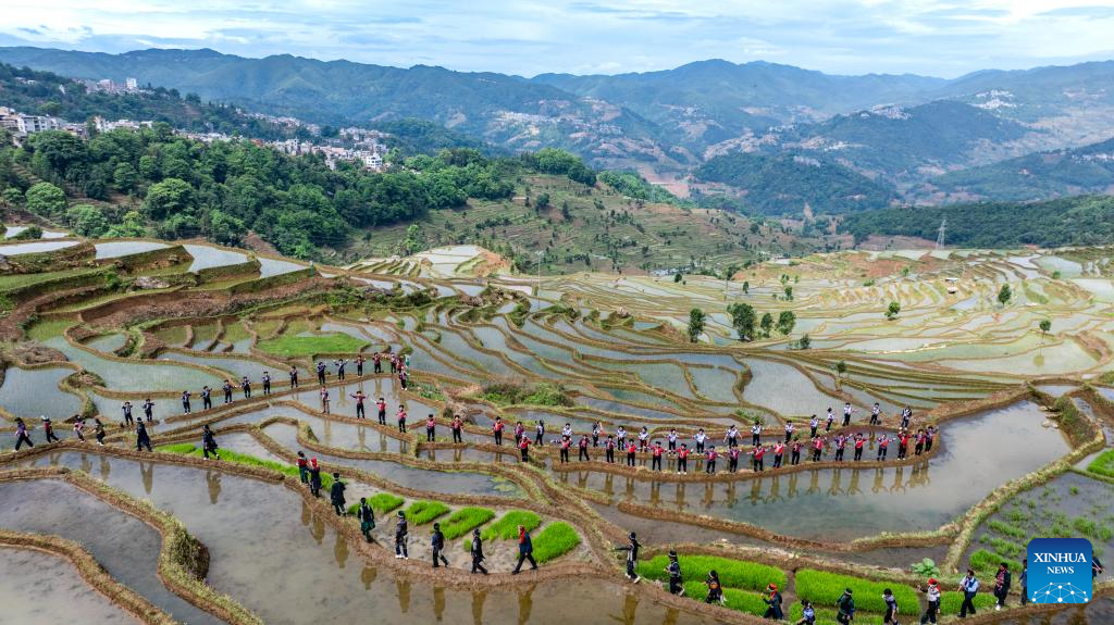 Villagers perform during an event marking the beginning of rice planting in the terraced fields in Jiayin Village of Honghe County of Honghe Hani and Yi Autonomous Prefecture, southwest China's Yunnan Province, May 2, 2025. (Xinhua/Hu Chao)