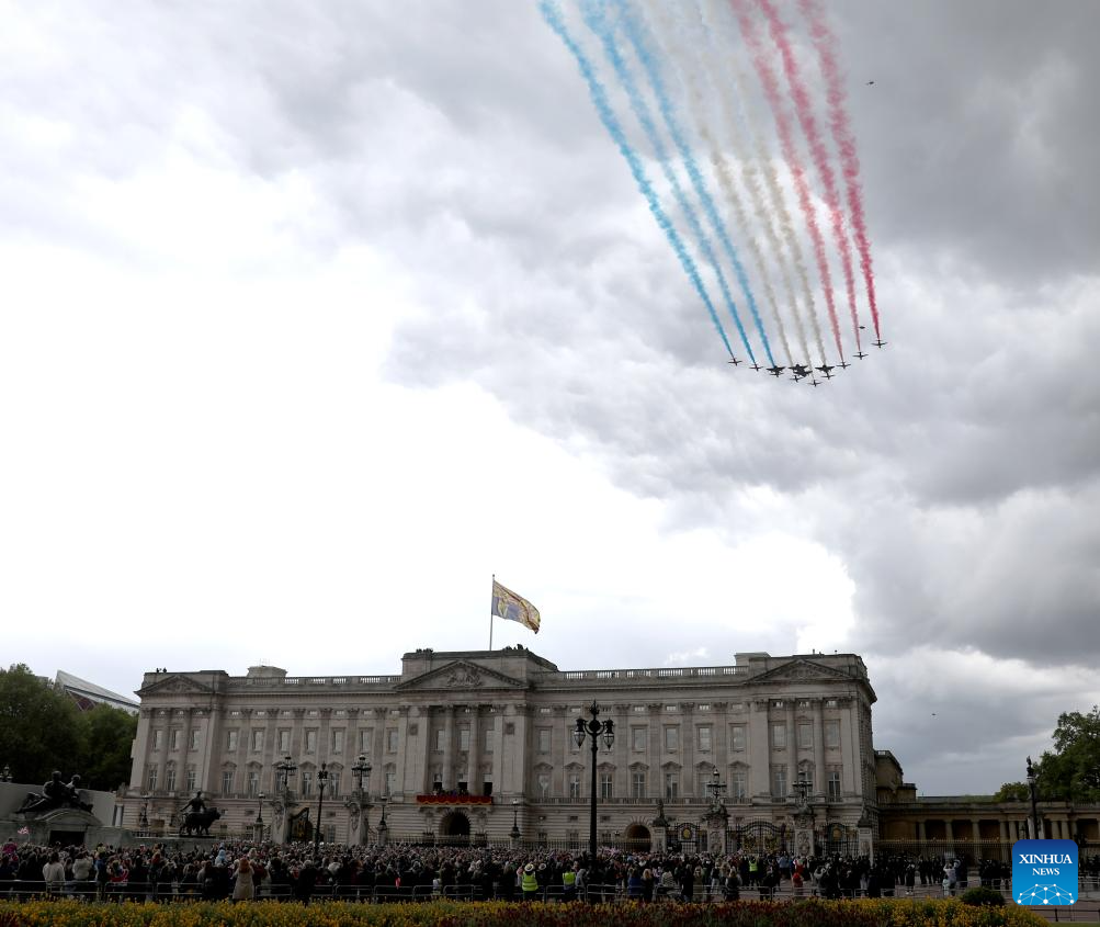 Planes fly in formation over Buckingham Palace in London, Britain, on May 5, 2025. Britain held military processions and a Royal Air Force flypast on Monday to commemorate the 80th anniversary of Victory in Europe (VE) Day. (Xinhua/Li Ying)