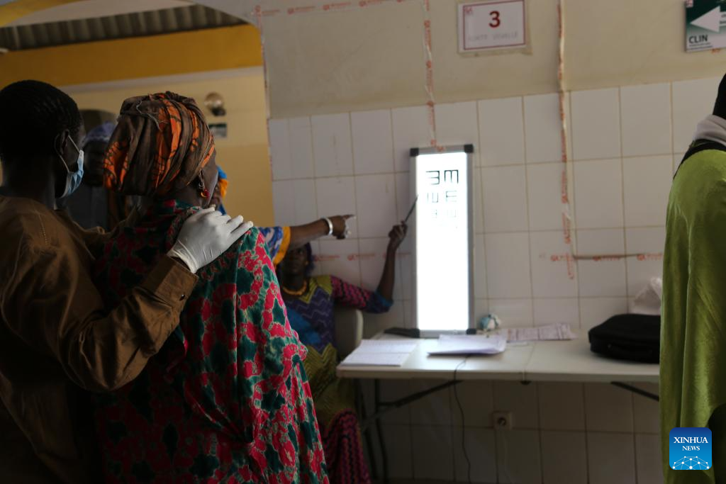 A patient undergoes a vision examination at the Regional Hospital Center of Fatick in Fatick, Senegal, May 2, 2025. (Xinhua/Si Yuan)