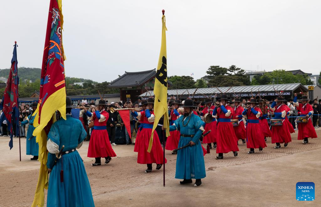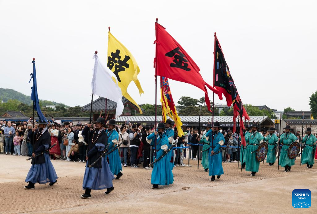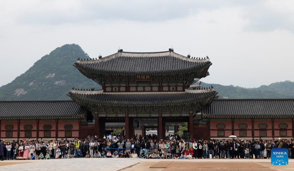 Tourists watch a cultural performance at Gyeongbokgung Palace in Seoul, South Korea, May 5, 2025. (Photo by Jun Hyosang/Xinhua)