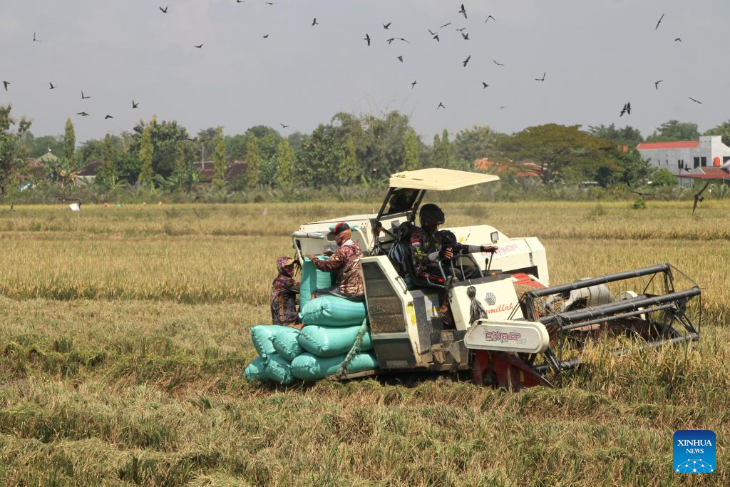 Farmers ride a harvester in paddy field during harvest time at Demakan village in Sukoharjo Regency, Central Java, Indonesia, May 6, 2025. Indonesia's total rice production is expected to reach 18.76 million tons between January and June this year, marking a significant 11.17 percent increase compared to the same period last year, Central Statistics Agency (BPS) predicted on Friday. (Photo by Bram Selo/Xinhua)