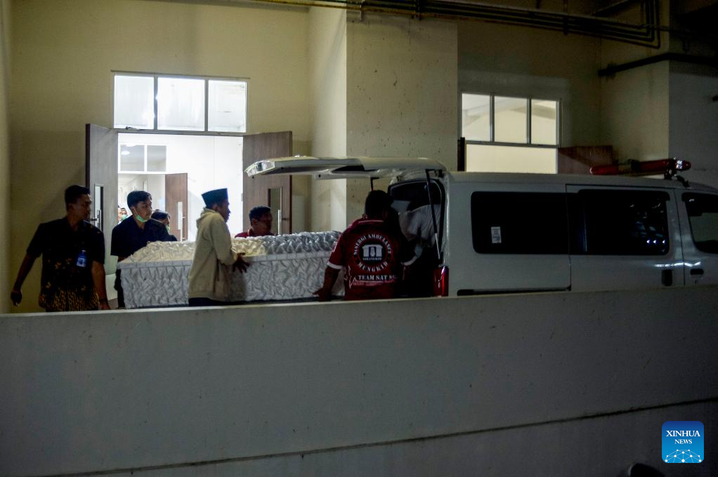 People transfer a coffin of a victim at a hospital in Purworejo, Central Java, Indonesia, May 7, 2025. At least 11 people were killed and five others injured when a truck collided with a small bus in Indonesia's Central Java province on Wednesday, a senior rescue official said. (Photo by Agung Supriyanto/Xinhua)