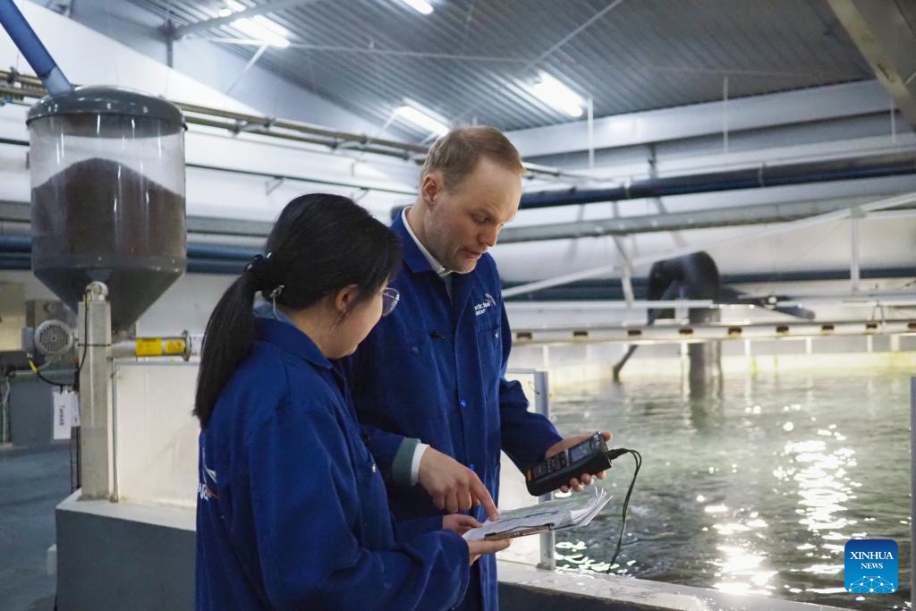 Andreas Thorud (R), general manager of Nordic Aqua (Ningbo), tests water quality at a land-based recirculating aquaculture system (RAS) facility for Atlantic salmon in Xiangshan County, Ningbo City of east China's Zhejiang Province, April 16, 2025. (Xinhua/Liu Ziyi)