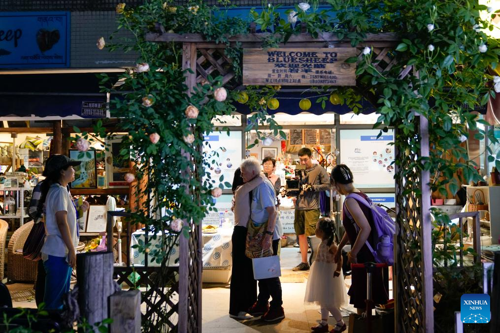 Rachel Grace Pinniger (4th L) bids farewell to her friend in front of Blue Sheep, a handicrafts shop, in Chengdu, southwest China's Sichuan Province, April 19, 2025. (Xinhua/Xu Bingjie)