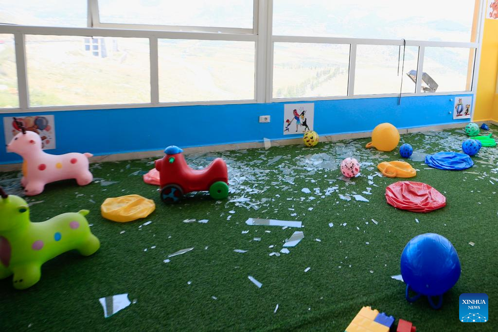 This photo taken on May 8, 2025 shows broken windows in a building after an Israeli airstrike in Kfar Tebnit, Upper Nabatieh, Lebanon. Israeli warplanes carried out a series of intense airstrikes on Thursday on the outskirts of the city of Nabatieh in southern Lebanon, according to official and security sources.