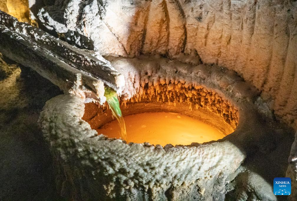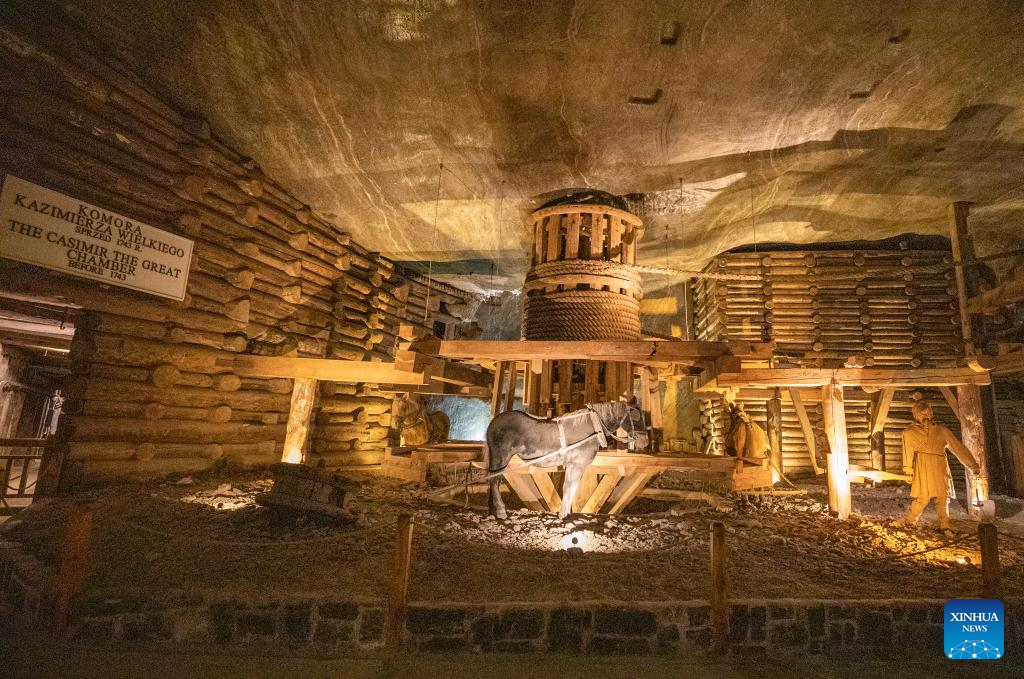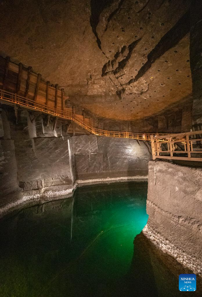This photo taken on May 7, 2025 shows an interior view of the Wieliczka Salt Mine in Wieliczka, Poland. The deposit of rock salt in Wieliczka has been mined since the 13th century. This major industrial undertaking is the oldest of its type in Europe. The Wieliczka Salt Mine illustrates the historic stages of the development of mining techniques in Europe from the 13th to the 20th centuries: the mine has hundreds of kilometers of galleries with works of art, underground chapels and statues sculpted in the salt, making a fascinating pilgrimage into the past. The Wieliczka Salt Mine was included in the UNESCO World Heritage List in 1978. (Xinhua/Zhang Fan)