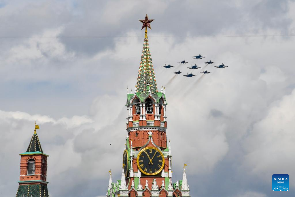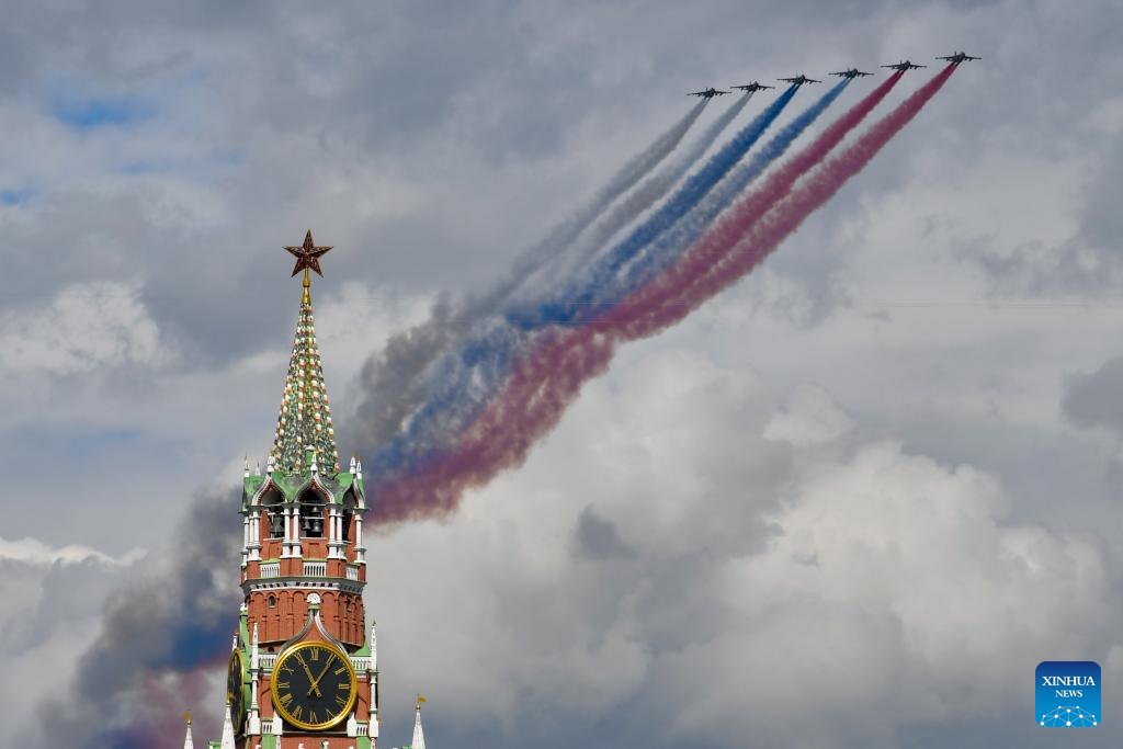 Aircraft fly in formation during a rehearsal for the Victory Day military parade, which marks the 80th anniversary of the Victory in the Soviet Union's Great Patriotic War, in Moscow, Russia, May 7, 2025. (Photo by Alexander Zemlianichenko Jr/Xinhua)