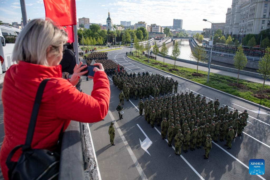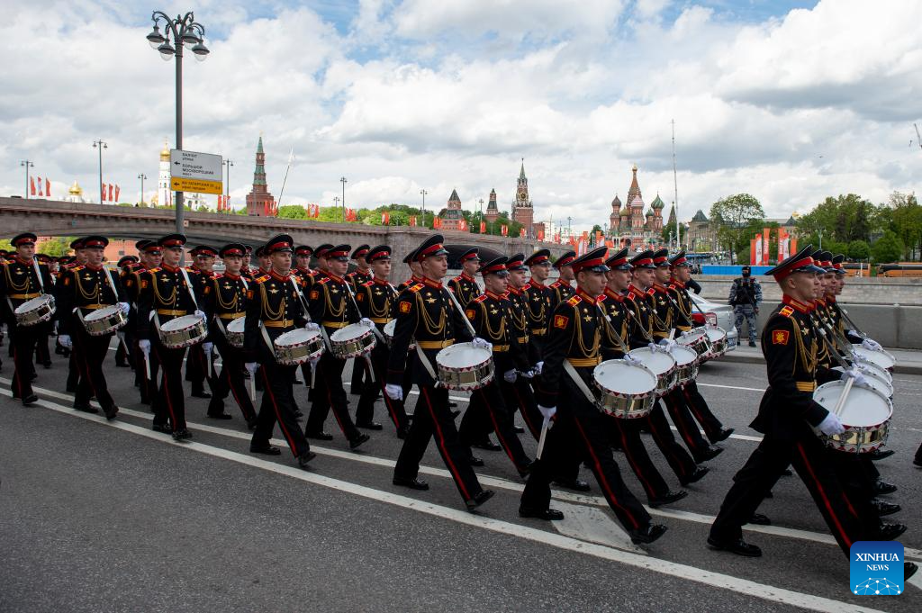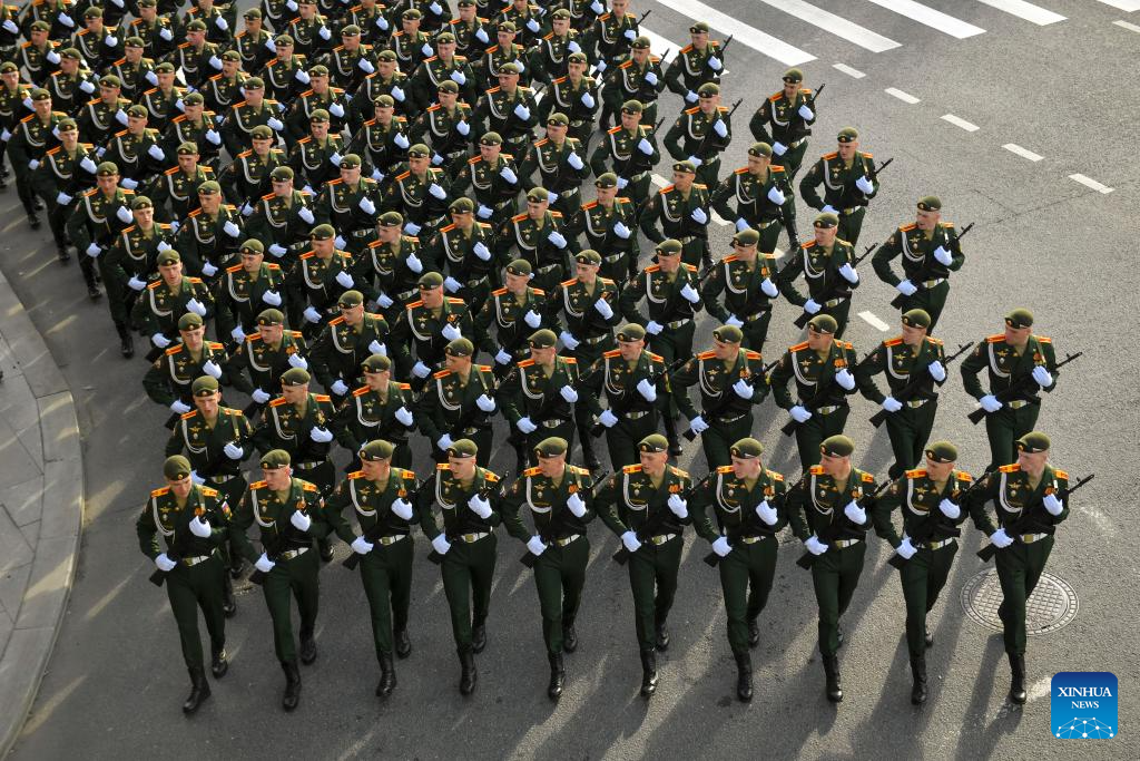 Soldiers prepare to attend a rehearsal for the Victory Day military parade, which marks the 80th anniversary of the Victory in the Soviet Union's Great Patriotic War, in Moscow, Russia, May 7, 2025. (Photo by Alexander Zemlianichenko Jr/Xinhua)