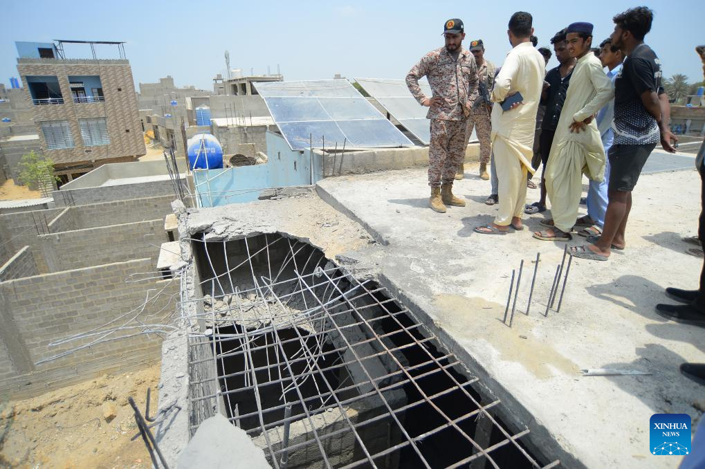 An Indian drone strike site is cordoned off in Karachi, Pakistan on May 8, 2025. At least one civilian was killed and five others, including four military personnel, were injured in a series of drone strikes by India targeting multiple locations in Pakistan since the early hours of Thursday, the Pakistani military said Thursday.