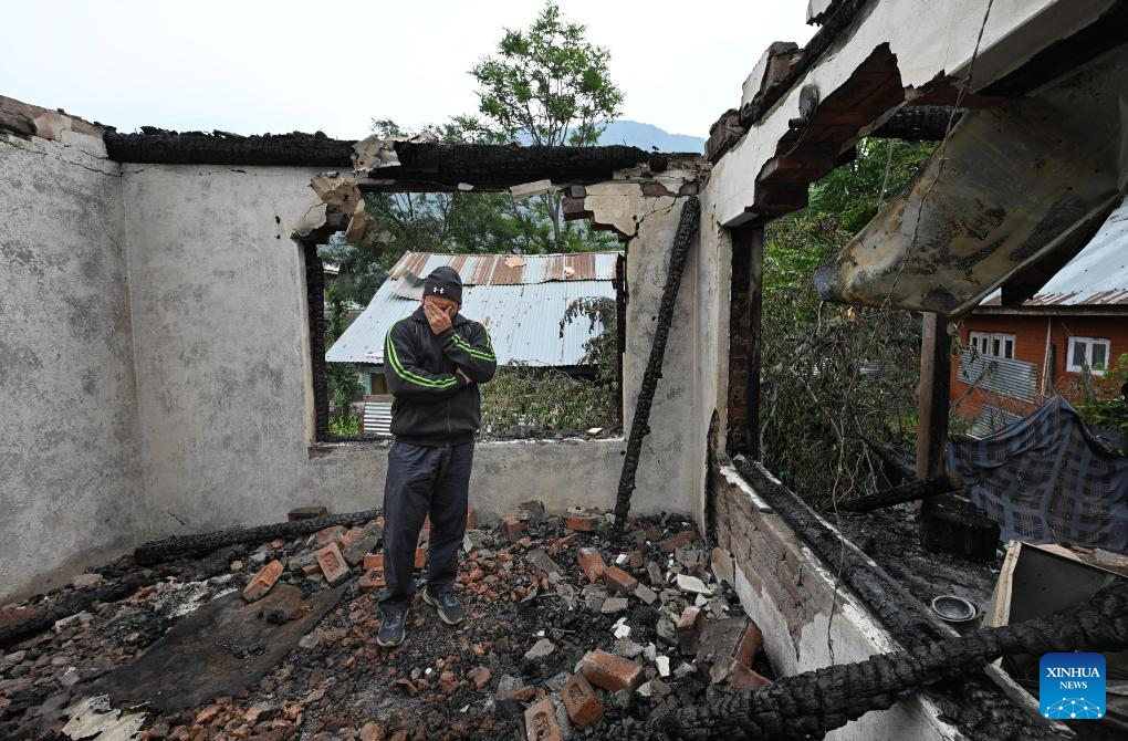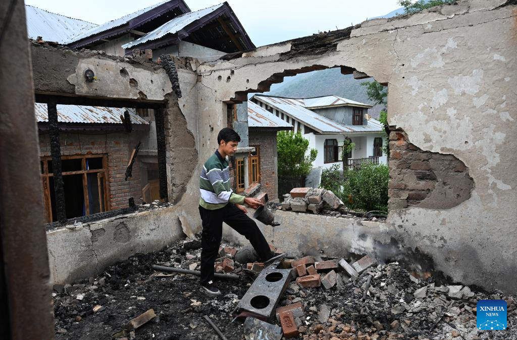 A boy inspects a house that was damaged during skirmishes between the troops of India and Pakistan in Salamabad near Line of Control (LoC), about 110 km north of Srinagar city, the summer capital of Indian-controlled Kashmir, May 8, 2025. (Xinhua/Javed Dar)