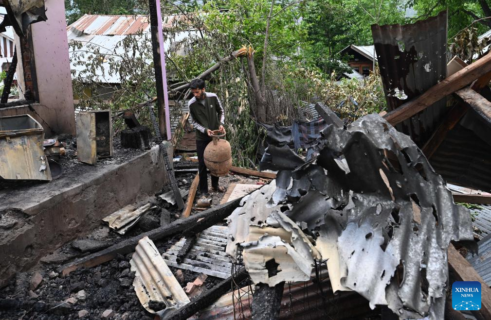 A man collects his belongings from his house that was damaged during skirmishes between the troops of India and Pakistan in Salamabad near Line of Control (LoC), about 110 km north of Srinagar city, the summer capital of Indian-controlled Kashmir, May 8, 2025. (Xinhua/Javed Dar)