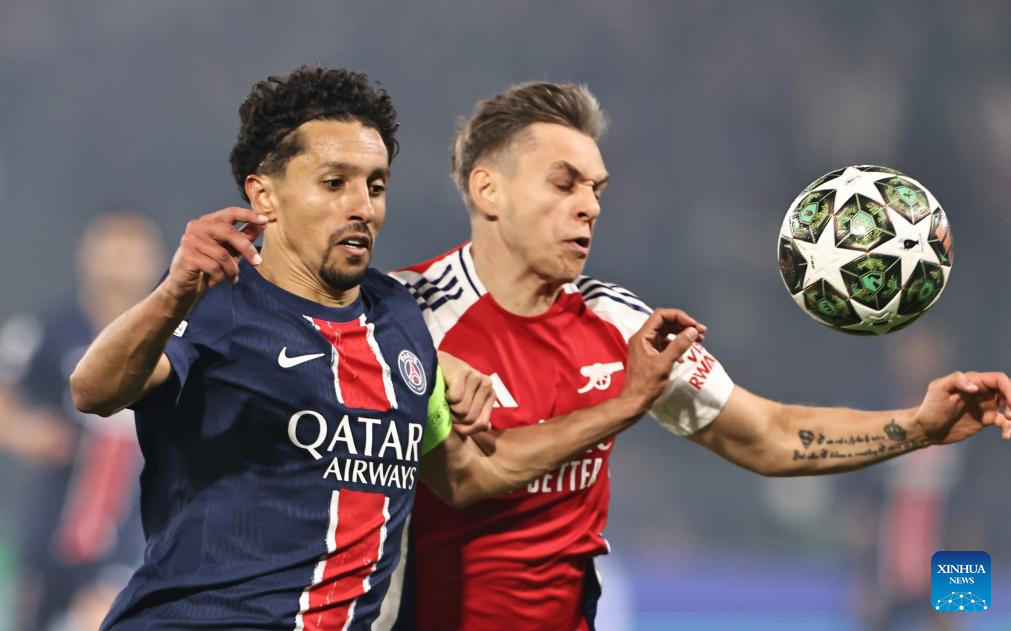 Paris Saint-Germain's Marquinhos (L) vies with Arsenal's Leandro Trossard during the UEFA Champions League semifinal second leg match between Paris Saint-Germain and Arsenal at the Parc des Princes stadium in Paris, France, May 7, 2025. (Xinhua/Gao Jing)