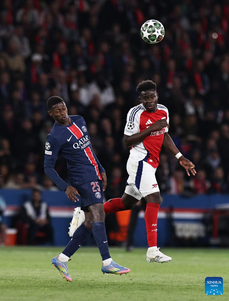 Paris Saint-Germain's Nuno Mendes (L) vies with Arsenal's Bukayo Saka during the UEFA Champions League semifinal second leg match between Paris Saint-Germain and Arsenal at the Parc des Princes stadium in Paris, France, May 7, 2025. (Xinhua/Gao Jing)